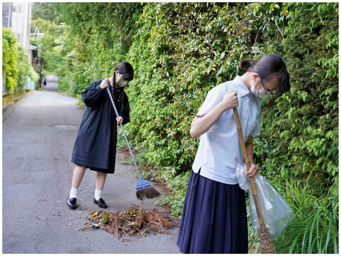 中学1年生~高校3年生の縦割りグループが分担して、水曜日の放課後、定期的に強羅駅付近と学校周辺の清掃活動を行っています。地元の方だけでなく、観光客の方々にも「ご苦労様、ありがとう」と声をかけていただくことも多く、生徒たちのやる気につながっています。春は桜の花びら、秋は落ち葉を集め、冬には雪かきをすることも…四季の移ろいを感じるひと時です。