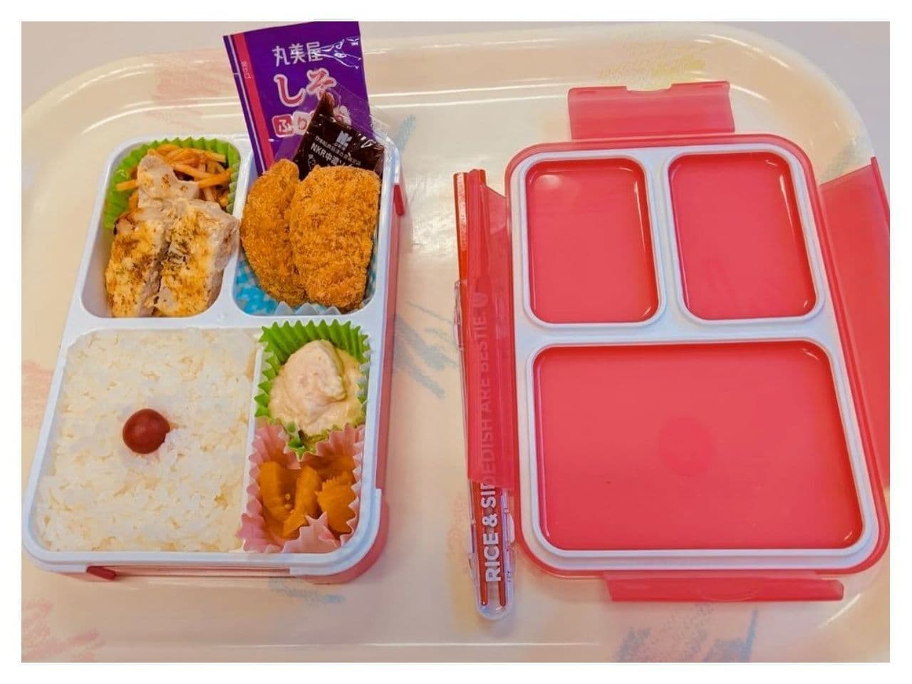 毎日昼食時間に合わせて学校に届けられるので、温かいお弁当が食べられます。毎月11日の節約白百合ランチの日にはおにぎり2個が届きます。