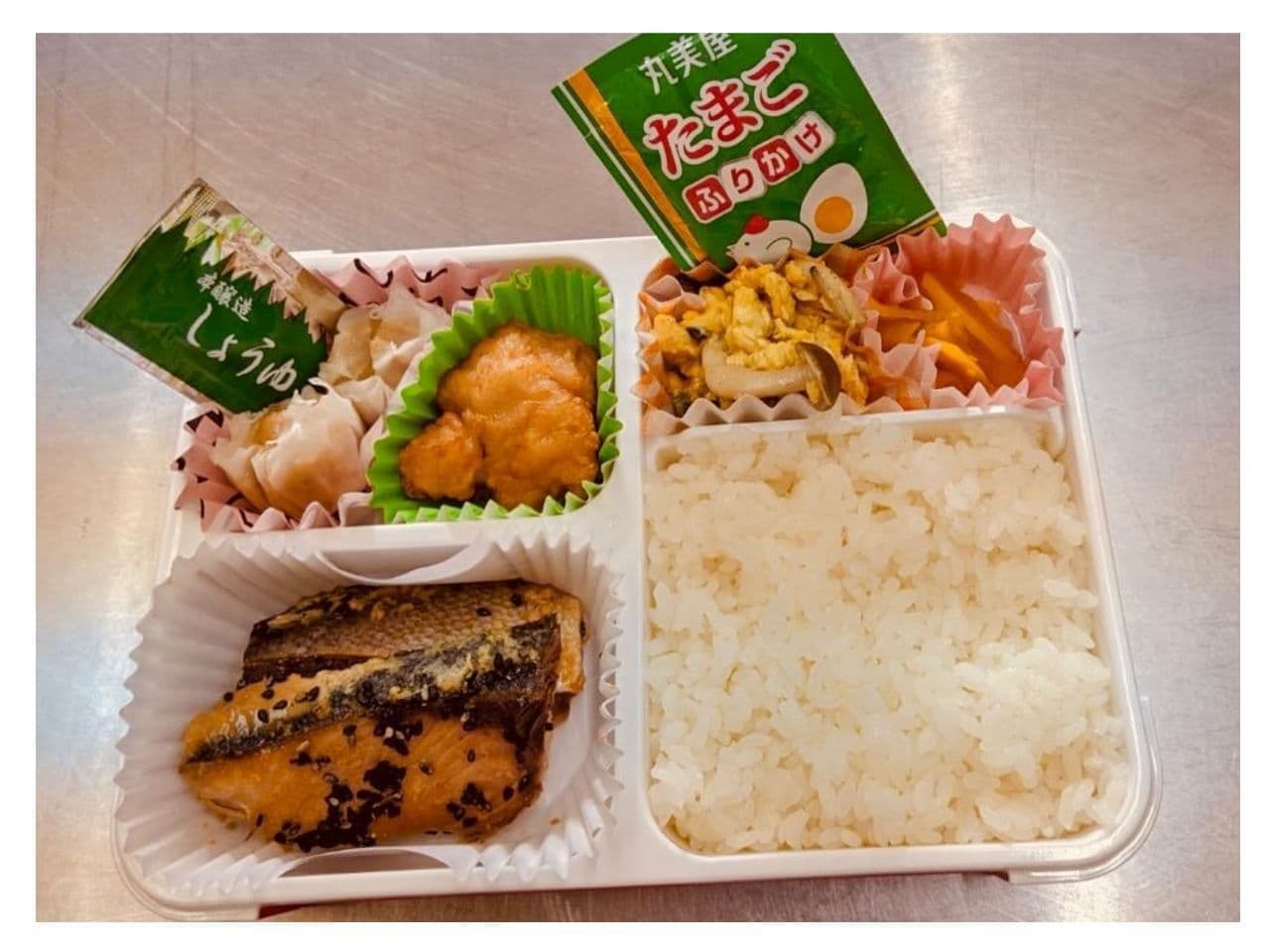 毎日昼食時間に合わせて学校に届けられるので、温かいお弁当が食べられます。毎月11日の節約白百合ランチの日にはおにぎり2個が届きます。