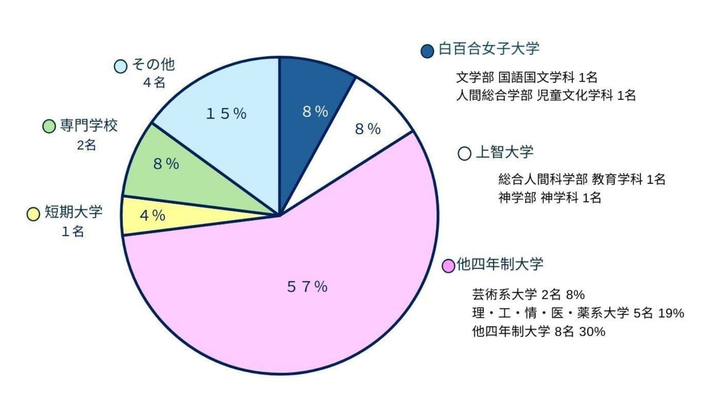 姉妹校である白百合女子大学を始め、多数の大学の指定校推薦枠があります。少人数の学校なので、たくさんの選択肢の中から自分の希望する進路に合った大学を選ぶことが出来ます。特に、上智大学のカトリック校対象特別入試の制度により、上智大学への進学者数を伸ばしています。